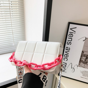 撞色女包新款时尚链条压痕方格宽带单肩斜挎包简约洋气...