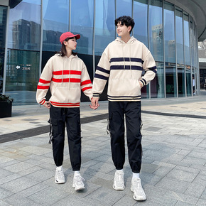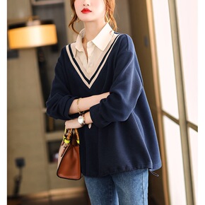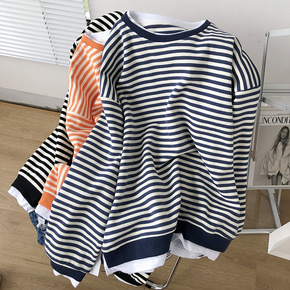 条纹假两件圆领卫衣女2021秋季炸街款休闲套头学生...