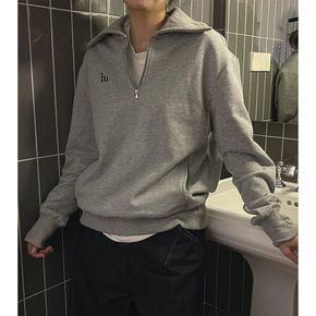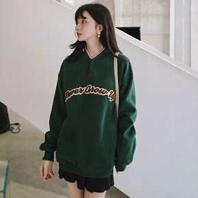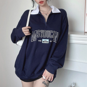 美式复古翻领半拉链卫衣女学院风宽松叠穿宽松字母刺绣...