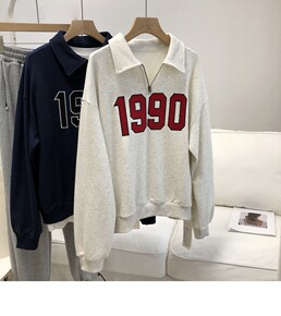 欧美时尚Polo领拉链收口学院风字母印花撞色长袖宽...