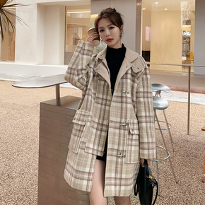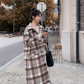 实拍2021年秋冬季新款格纹中长款毛呢外套韩版宽松...