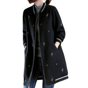 中长款刺绣毛呢外套女加厚棒球服秋冬季宽松立领韩版休...