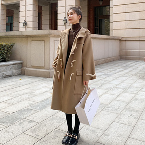 实拍毛呢外套中长款冬法式气质牛角扣宽松斗篷感日系呢...