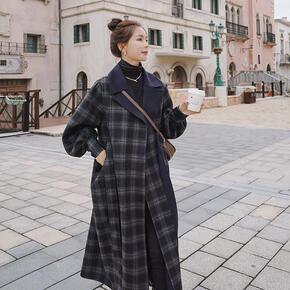 实拍新款格子毛呢外套女中长款秋冬韩版过膝复古赫本风...