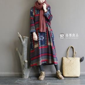 喜墨原创复古棉麻连衣裙女冬季民族风宽松摇粒绒加厚棉...