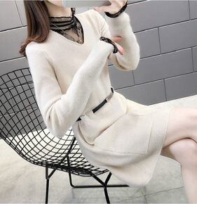 蕾丝领毛衣女小个子中长款V领网纱蕾丝拼接收腰大口袋...