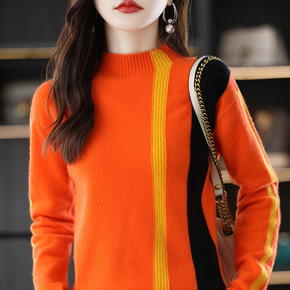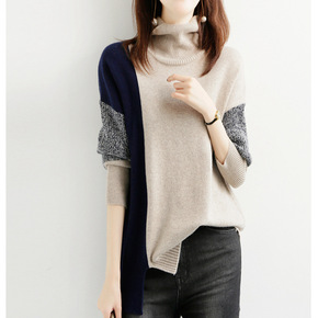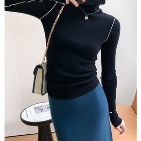 秋冬新款女毛衣半高领羊毛衫打底针织衫女拼接套头短款...