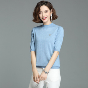 女装2022春季新品短袖针织衫时尚纯色气质套头半高...
