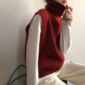 言双 纯色高领无袖毛衣女2022春季新款复古叠穿外...