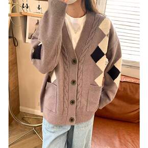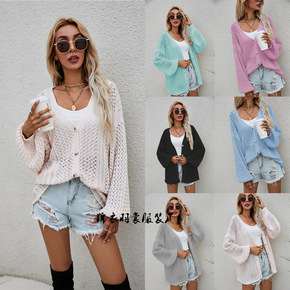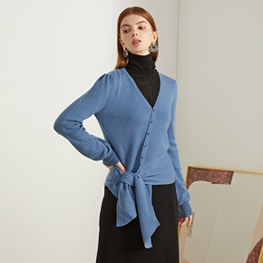 2021秋季新款气质休闲羊毛V领斜开纽扣开衫女式针...