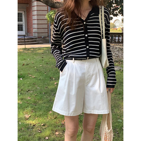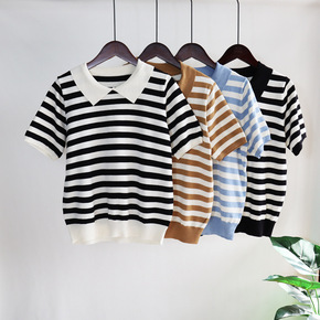 2022春夏新款韩版宽松针织短袖上衣女条纹撞色翻领...
