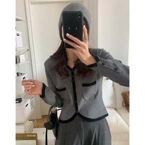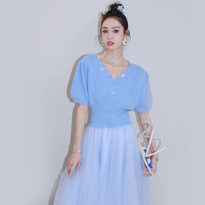 楠涛小香风设计感收腰短款针织开衫女2022春季V领...