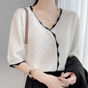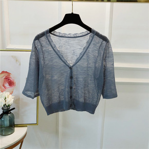 夏季短款长袖针织衫防晒衣气质通勤圆领薄开襟镂空开衫...