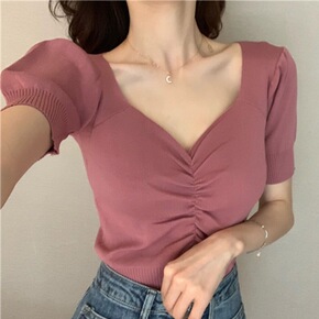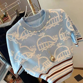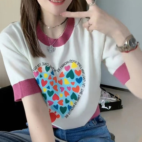 2022夏季新款欧货撞色圆领针织衫女短袖薄款爱心冰...