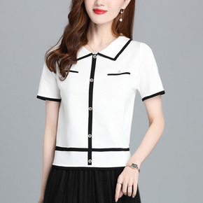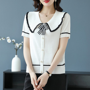娃娃领冰丝短袖t恤女夏季薄款针织衫洋气减龄钉珠套头...