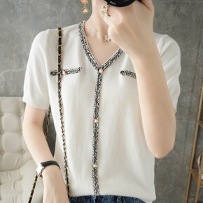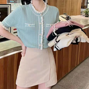 2022夏季跨境女式针织衫 韩版V领小香风短袖开衫...