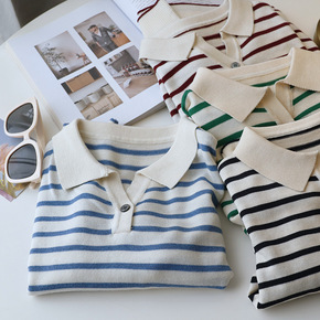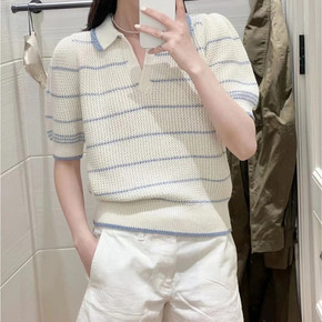绵软亲肤~polo领短袖条纹针织衫女春夏薄款休闲洋...