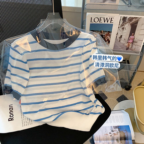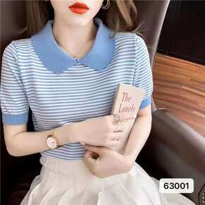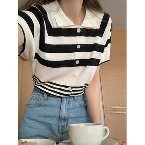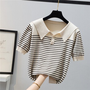 夏季新款韩版条纹娃娃领短袖冰丝针织衫女薄款别致小个...