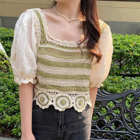 2022夏季新款法式方领镂空温柔甜美刺绣花边拼接针...