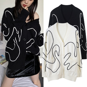 简约天鹅手锈气质V领长袖针织开衫女2020秋冬撞色...