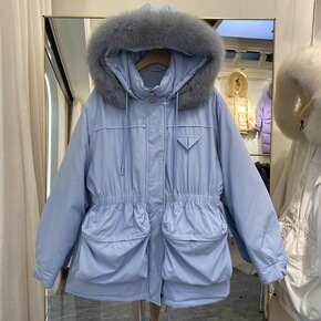 2021年韩版新款中长款加厚大毛领宽松连帽保暖白鸭...