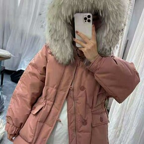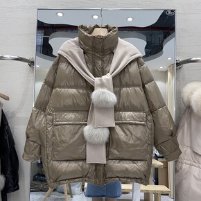 2021冬新款羽绒服女中长款加厚大毛领白鸭绒宽松收...