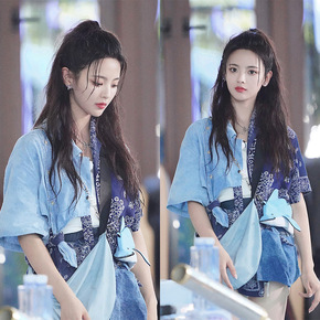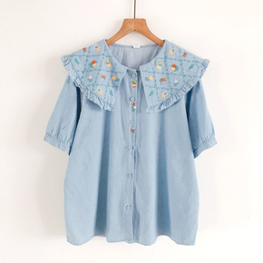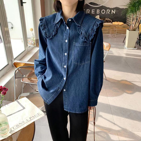莉之绮 洋气双层翻领木耳花边牛仔衬衫春装新款长袖上...