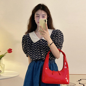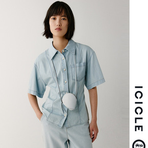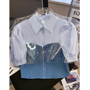 蓝色牛仔拼接短款衬衫女设计感小众夏季新款法式修身短...