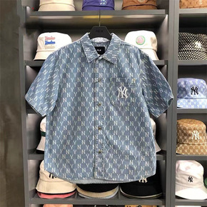 MLB韩国潮牌男女老花满印ny休闲宽松薄牛仔短袖衬...