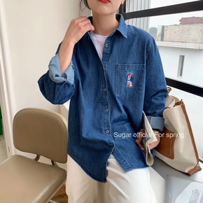牛仔衬衫女韩 bf风衬衣春款女装上衣 刺绣口袋衬衣...