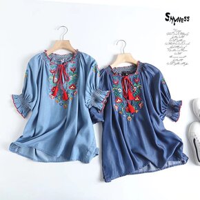 日韩女装批发 2022春季新款领口系带彩色刺绣天丝...