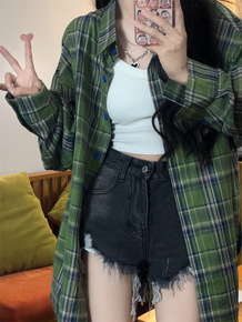 港风复古格子长袖衬衫女装夏季防晒开衫外套宽松pol...