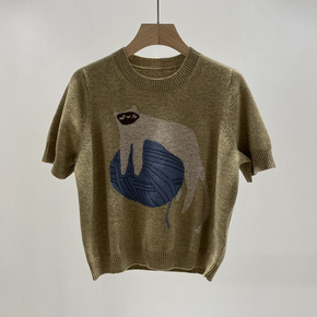 小禾女装21秋冬新款猫咪羊绒短袖针织衫 线团橄榄绿...