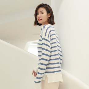 芭莎条纹针织衫2021秋季新款圆领宽松长袖打底衫套...