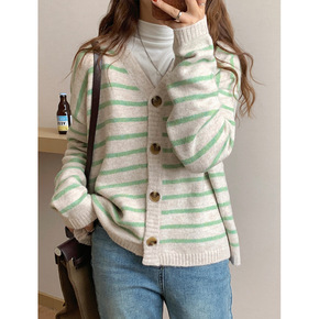 薇颂 条纹针织开衫女2021秋冬新款韩版宽松休闲柔...