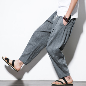 中国风 夏装大码亚麻裤男薄款宽松休闲裤哈伦裤九分裤...