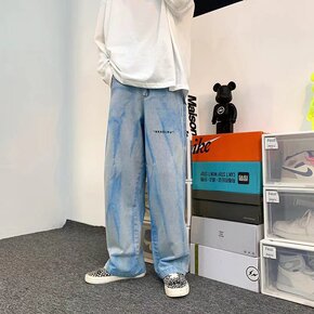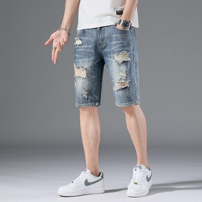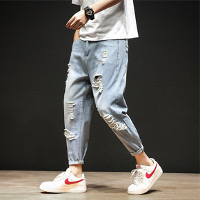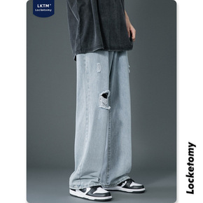 LKTM男装#秋季新款破洞薄款浅色牛仔裤男潮牌in...