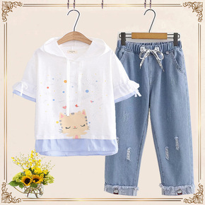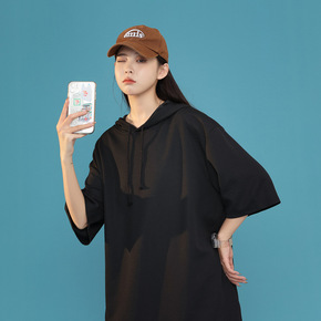 夏季新款 卡通印花宽松连帽拼色短袖T恤女学生卫衣3...