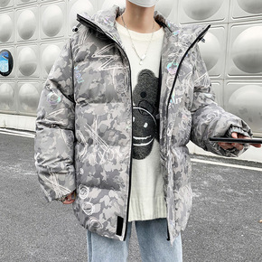 2021年冬装新款港风加厚连帽棉衣花色宽松情侣装棉...