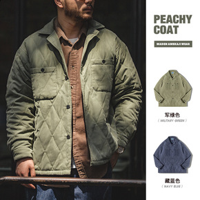 马登工装日系复古桃皮绒宽松古巴领菱格棉衣服单排扣厚...
