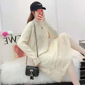 中长款蕾丝下摆连衣裙女22秋冬新款韩版麻花套头针织...