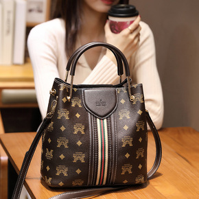 时尚真皮手提女包2020新款经典老花宽肩带水桶包大...