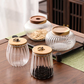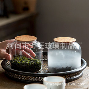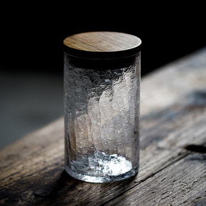 日式锤纹玻璃茶叶罐竹木盖透明冰裂玻璃茶罐密封罐储物...