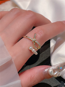小清新珍珠日常佩戴蝴蝶结戒指网红风气质微镶镀真金锆...