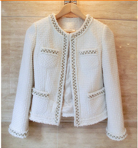 女2021秋冬新款小香风手工珍珠短款小个子羊毛呢大...