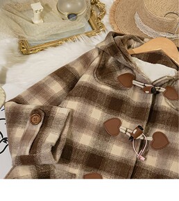 女装加工定制格子毛呢外套女牛角扣学院风连帽小个子日...