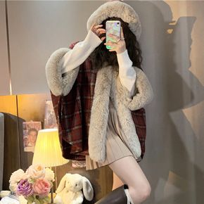 仿兔毛拼接呢子披肩大衣冬季新款洋气宽松格子斗篷连帽...