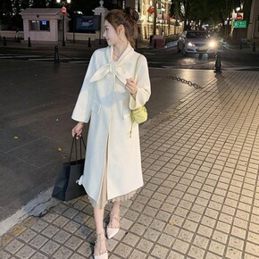 小个子2021年新款高级感气质中长款大衣白色蝴蝶结...