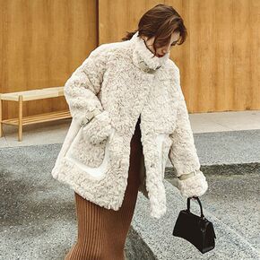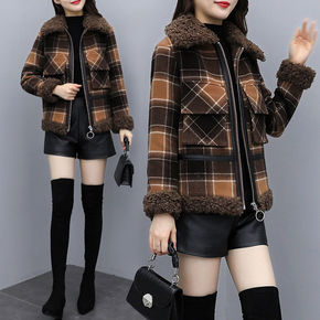 2021新款女装冬季羊羔毛拼接毛呢短外套女格子小个...