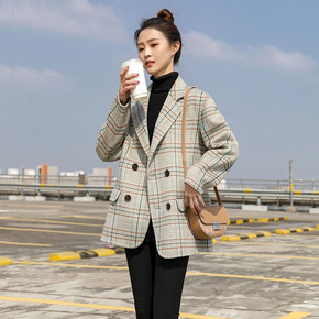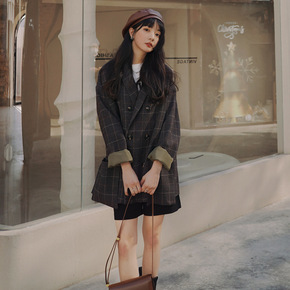 实拍新款格子西装毛呢外套女小个子宽松休闲学院风复古...
